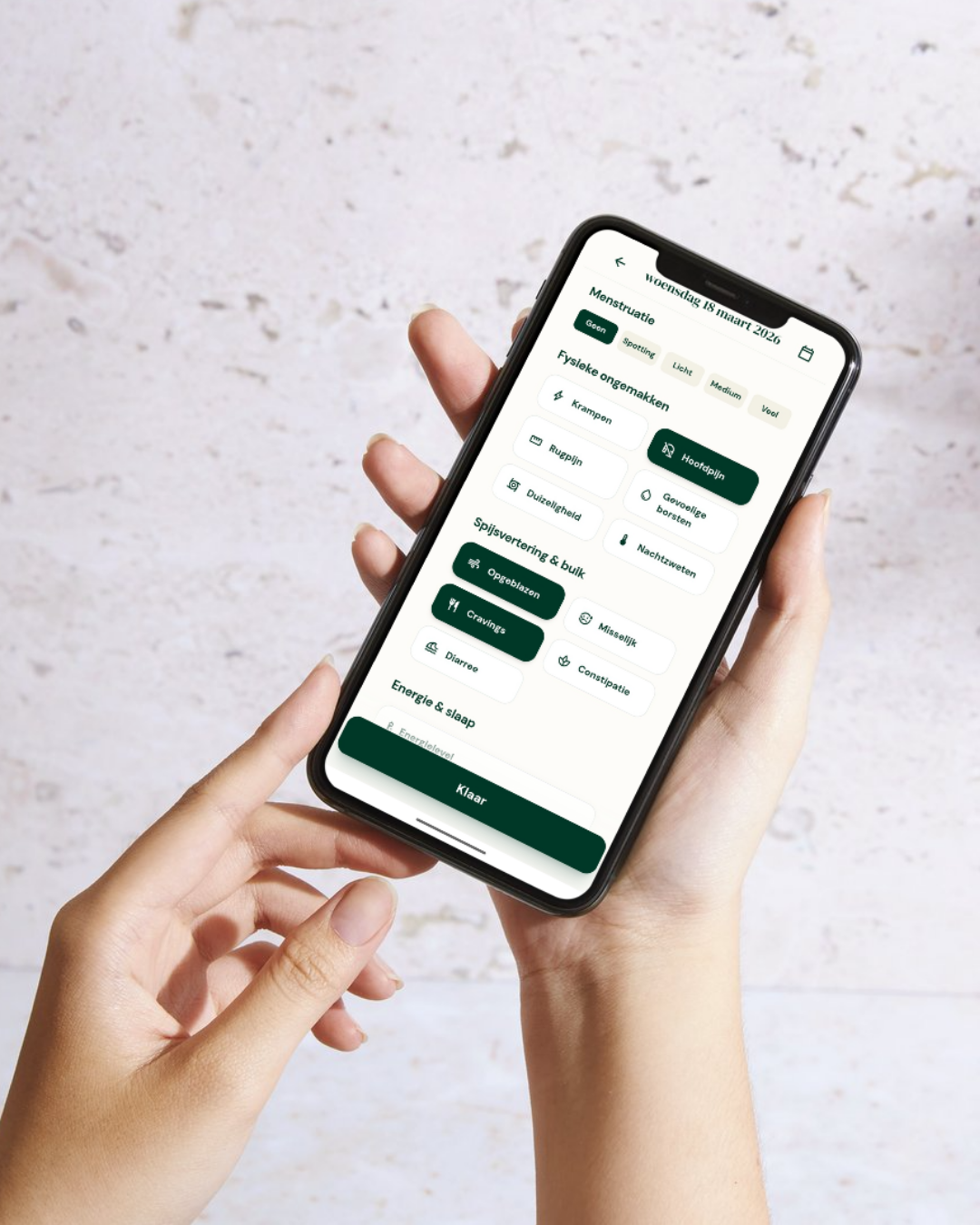 De Vier Fases: Ontvang direct inzicht in welke fase je zit (Menstruatie, Folliculair, Ovulatie of Luteaal).